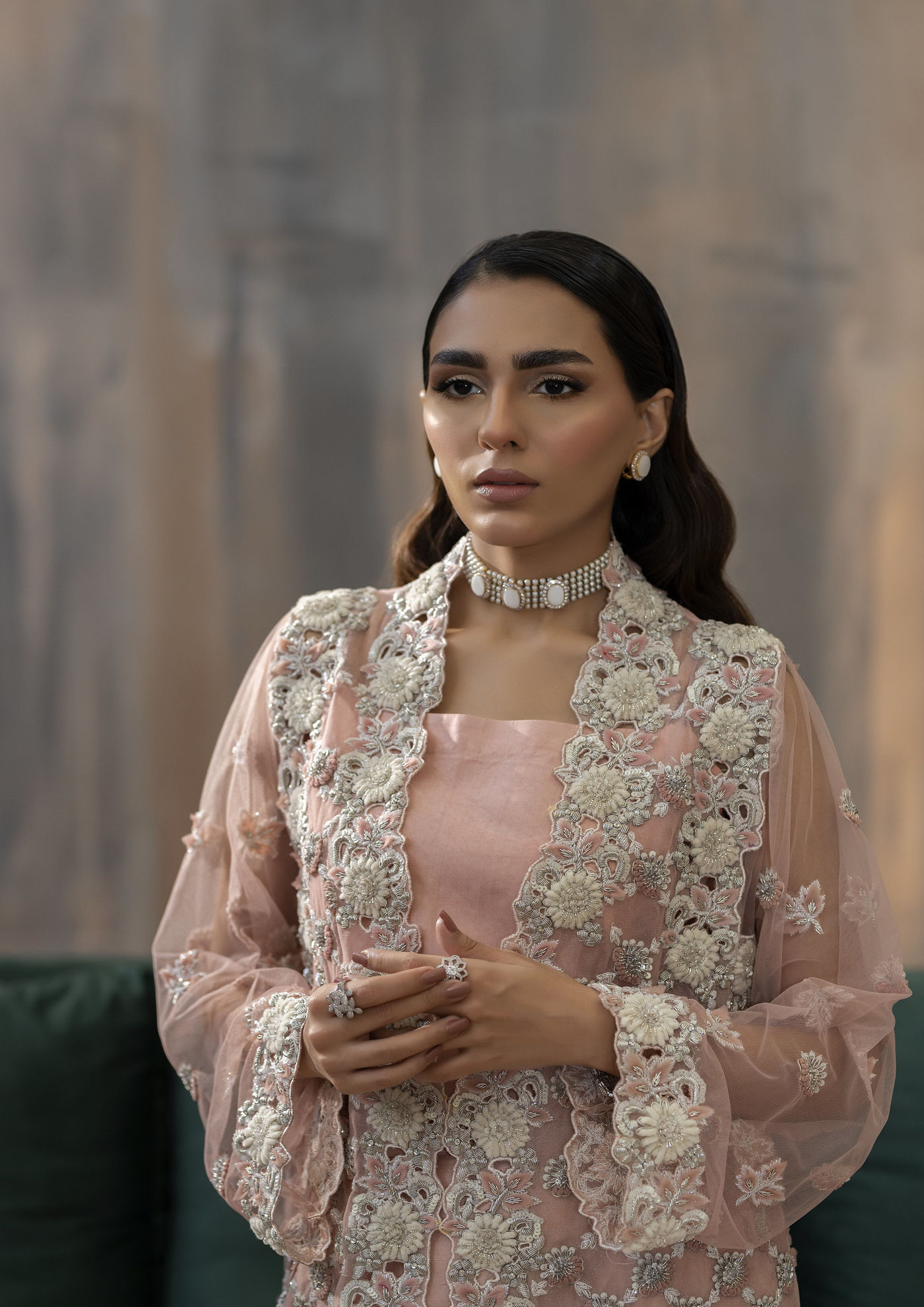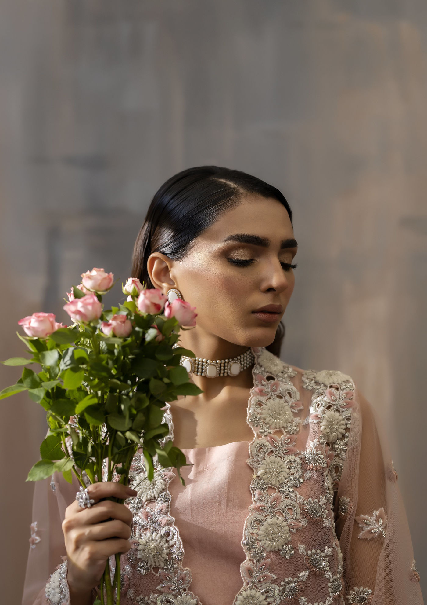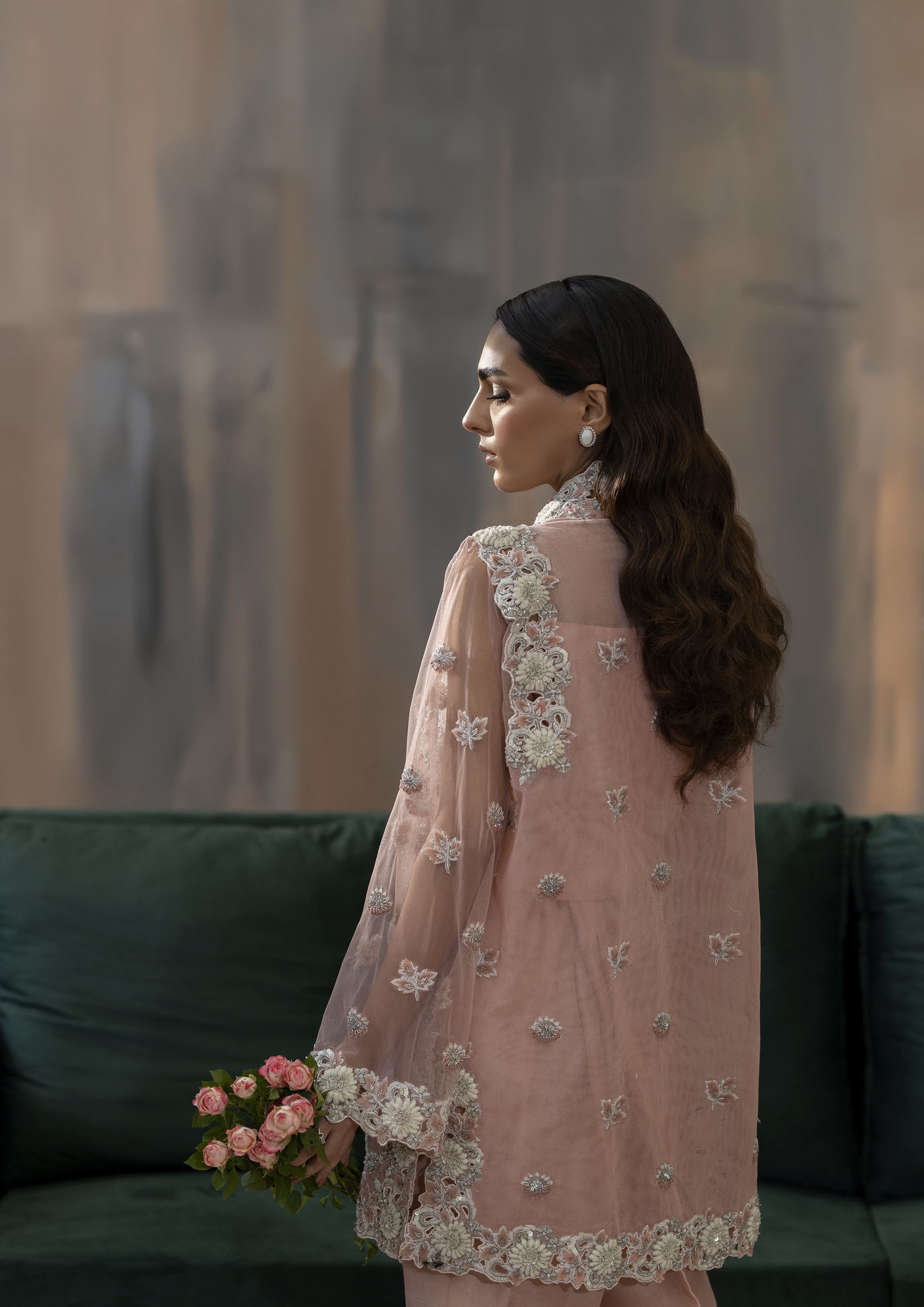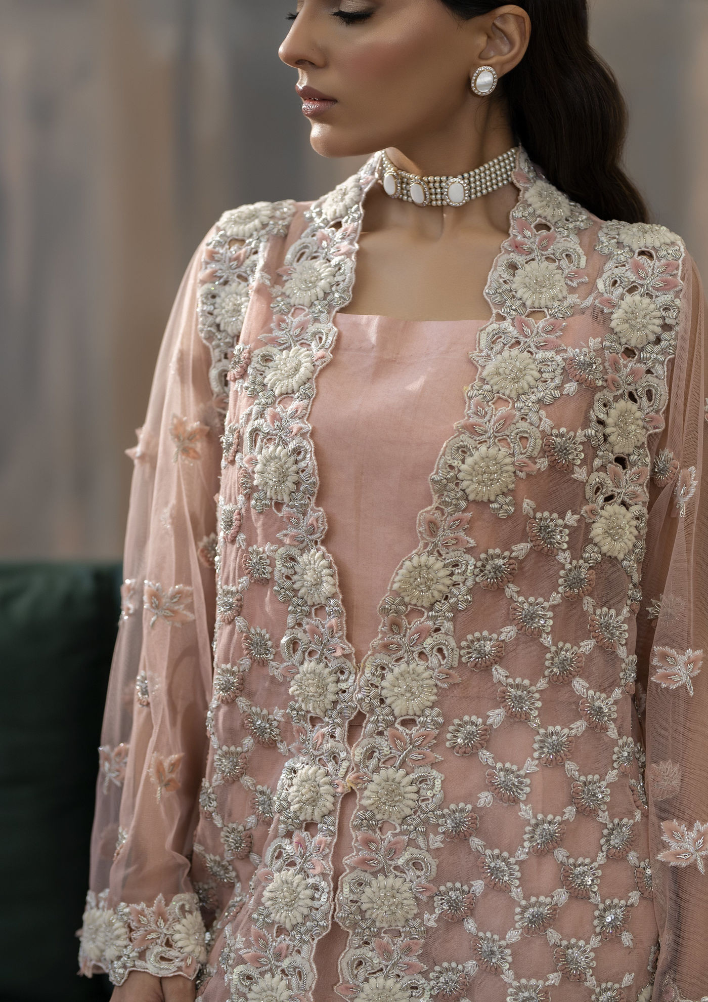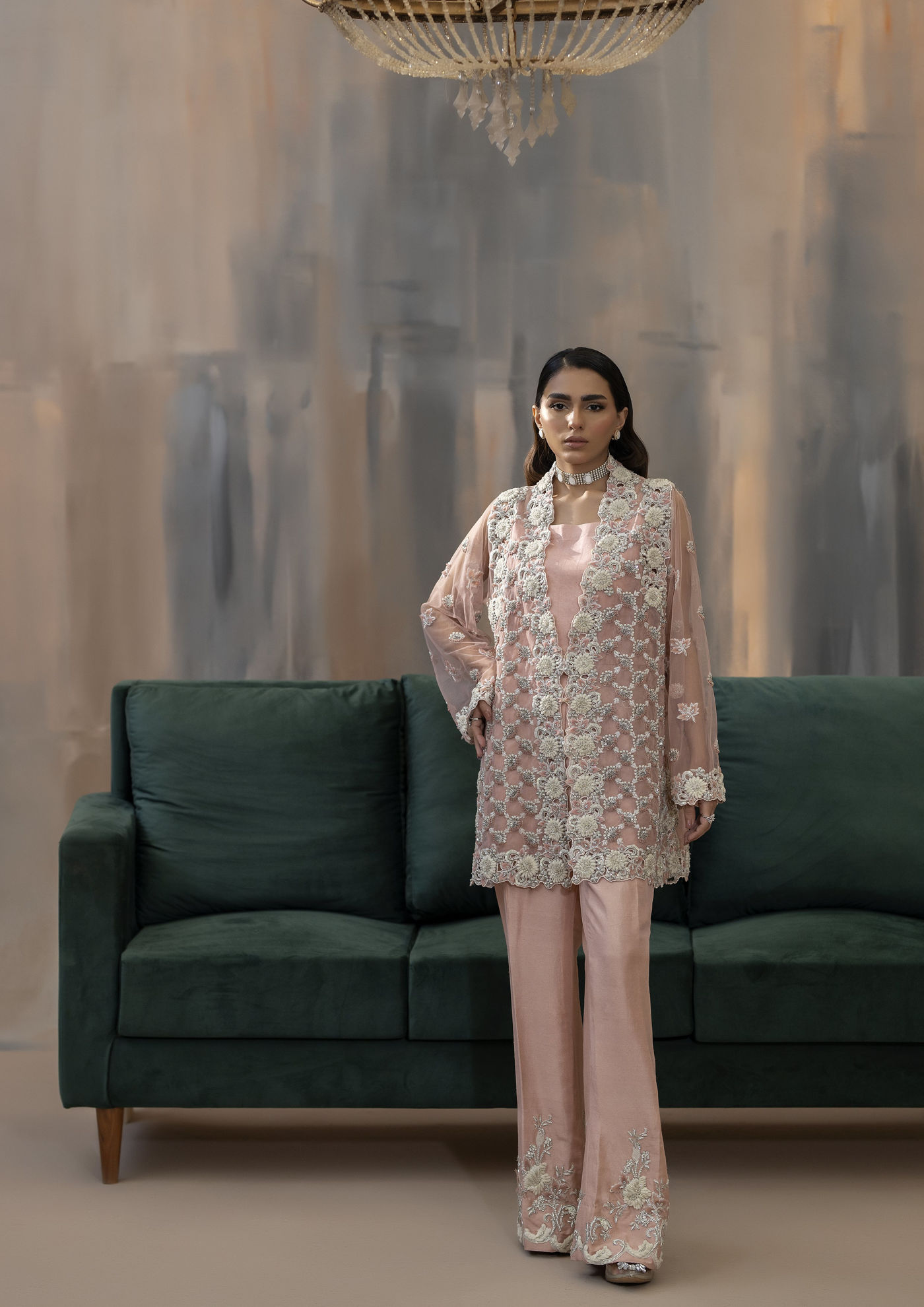 Embrace elegance with a modern twist in our pink formal wear ensemble. Featuring a sleek, embellished net jacket adorned with delicate silver work, this look combines classic Eastern grace with contemporary style. Perfect for making a statement this wedding season! rawsilk embellished pants and inner is included.