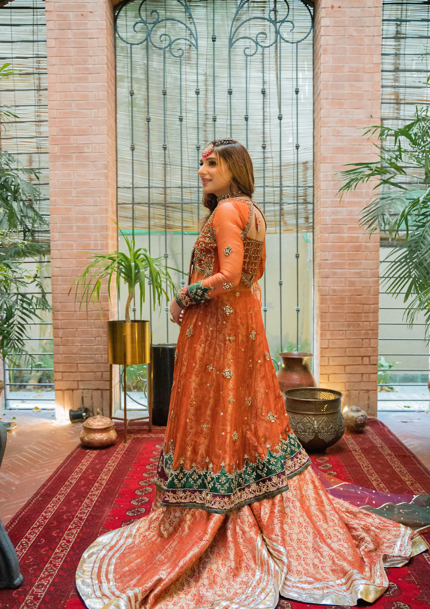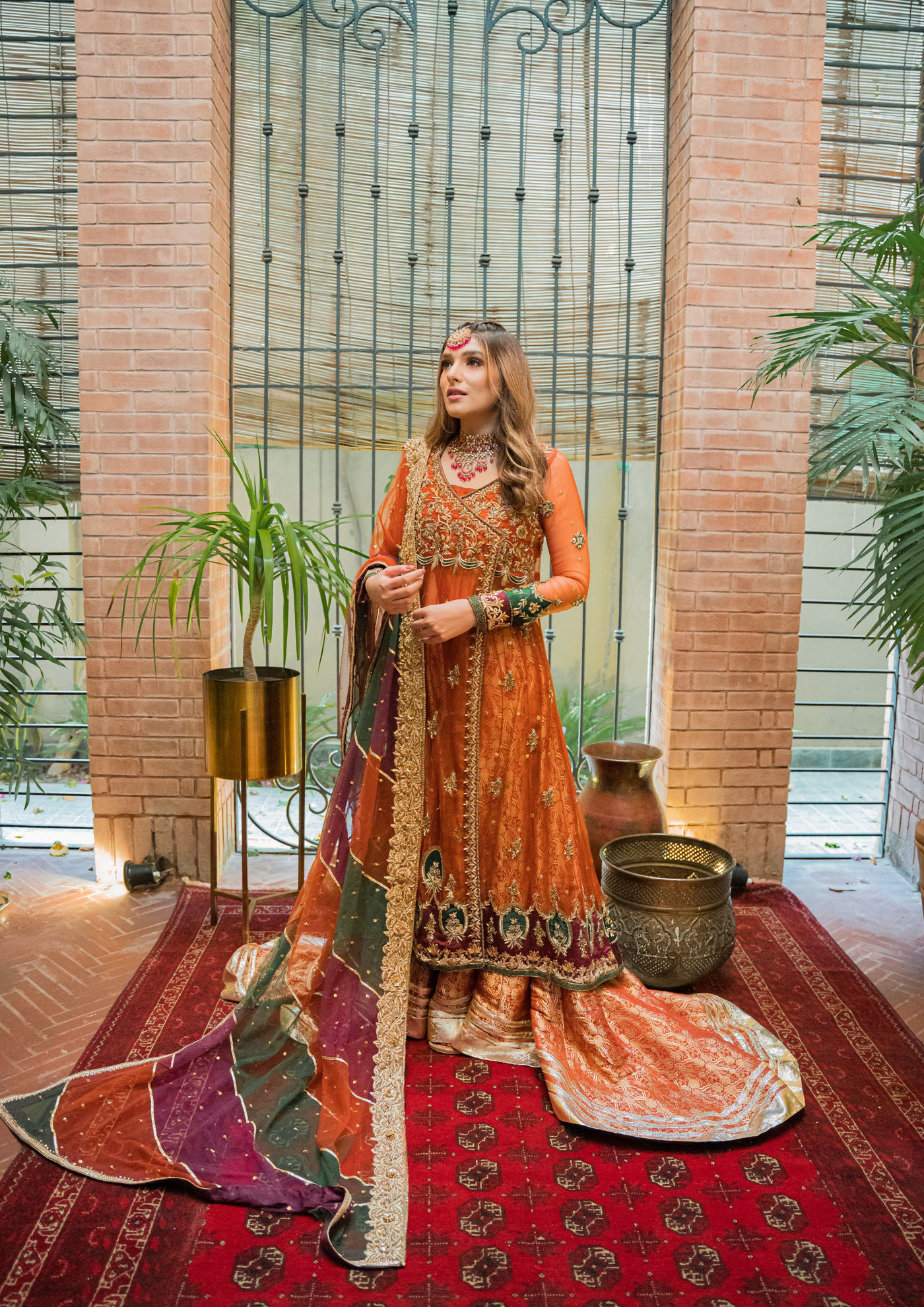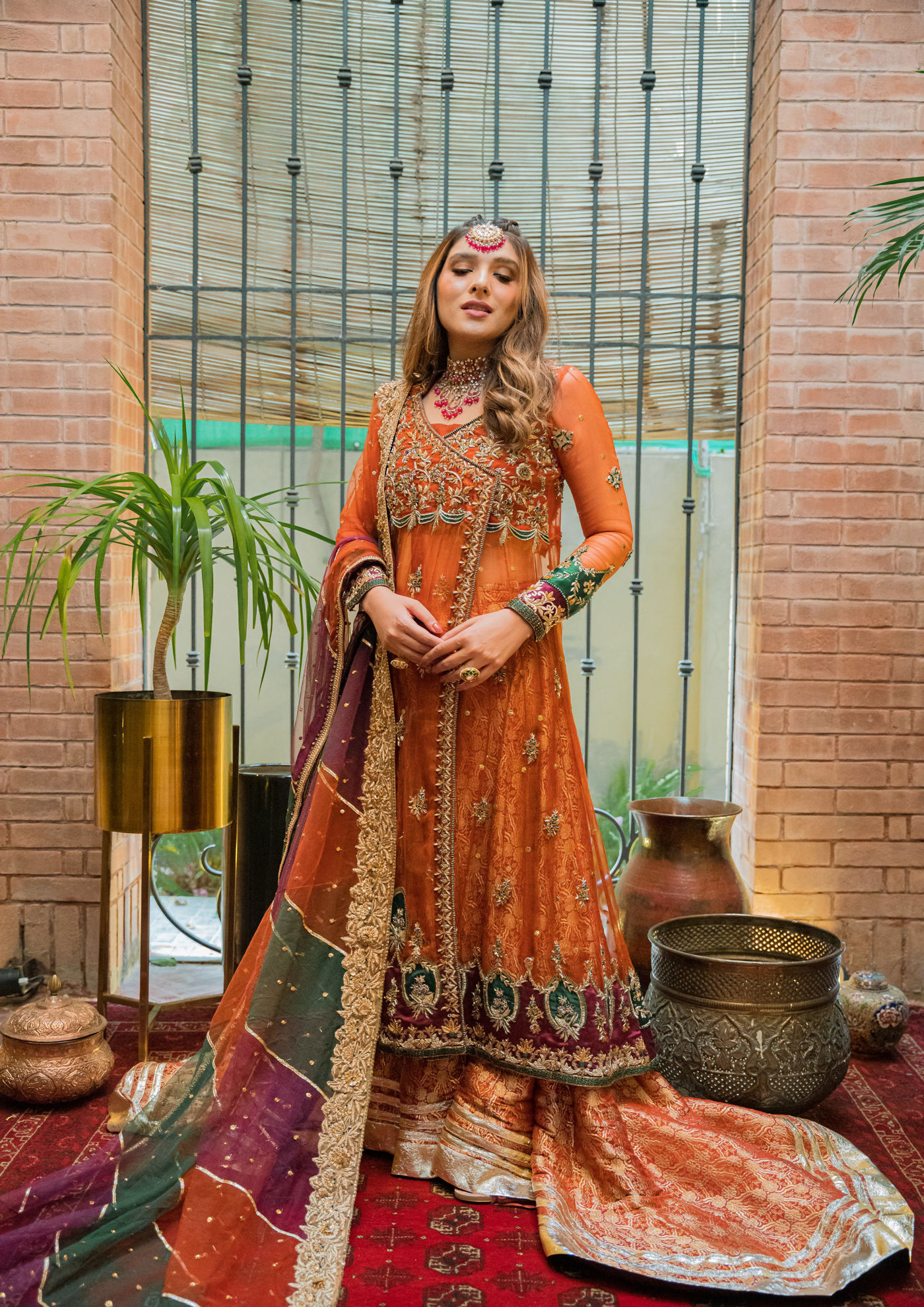 Dil Nasheen dances in our organza based angrakha flourished with gora, dabka and zardozi embellishments. Styling it with our banarsi dhaka gharara underneath ; Gorgeous net dupatta with gota work and a one-sided border to complete the look with grace.