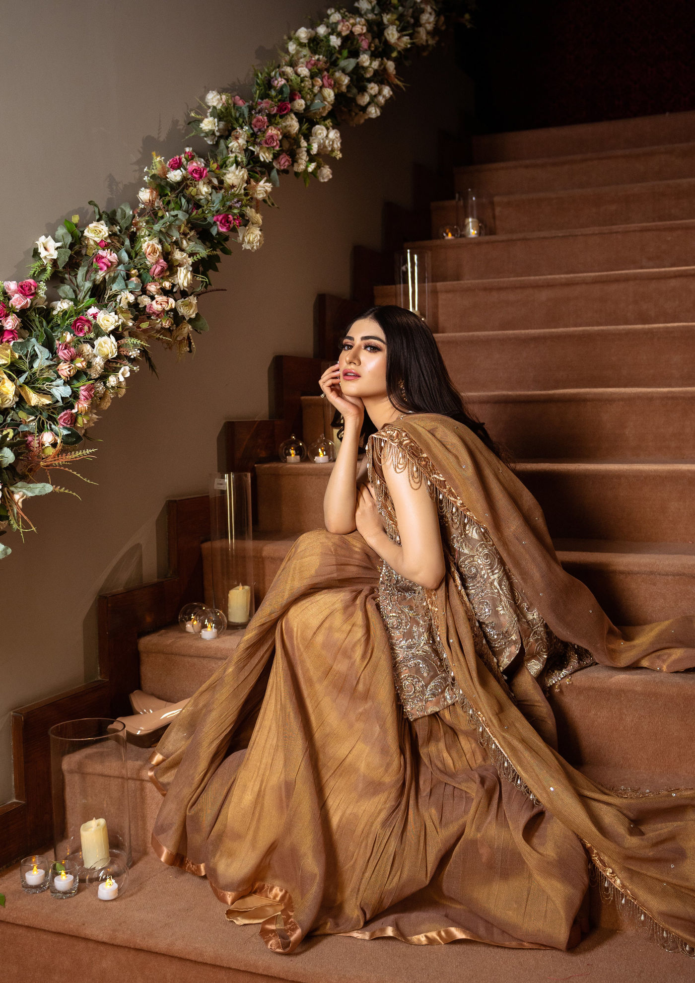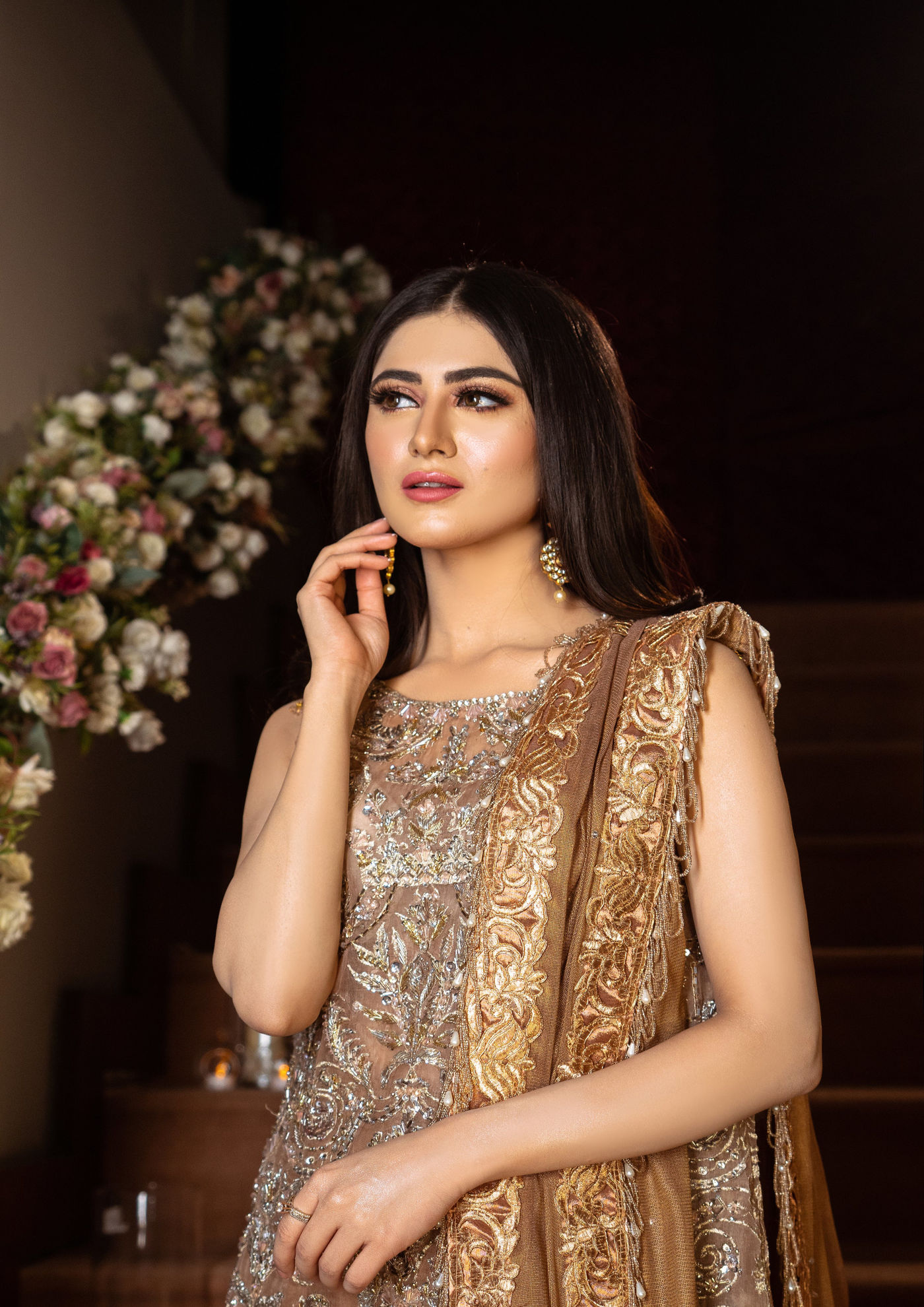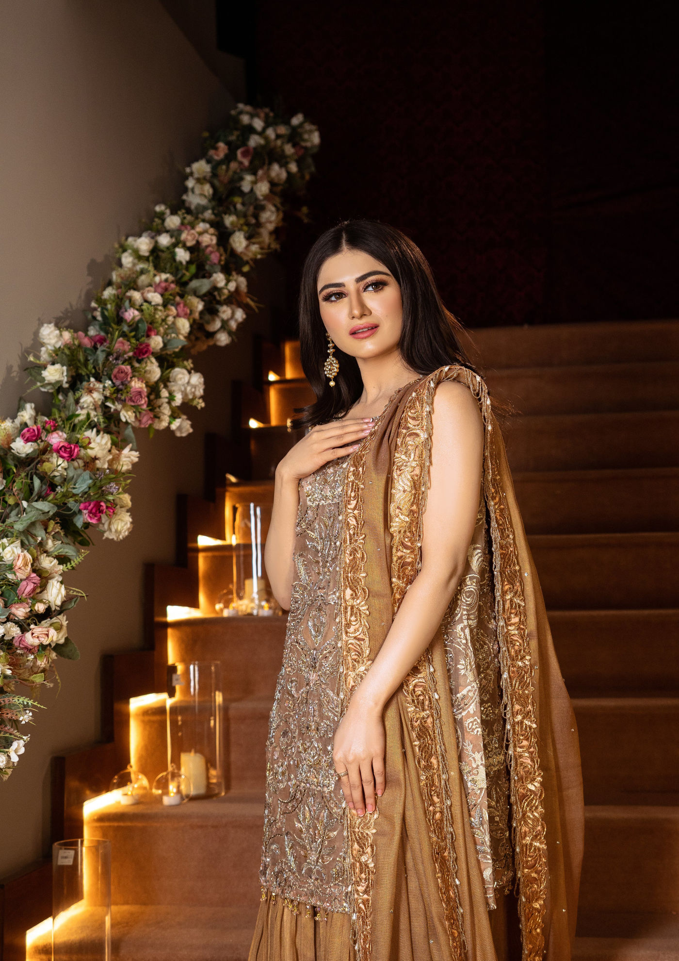Rose pink pure organza shirt finely embellished with traditional And modern work material. it is paired with shimmer cotton net crushed modern gharara and dopatta.