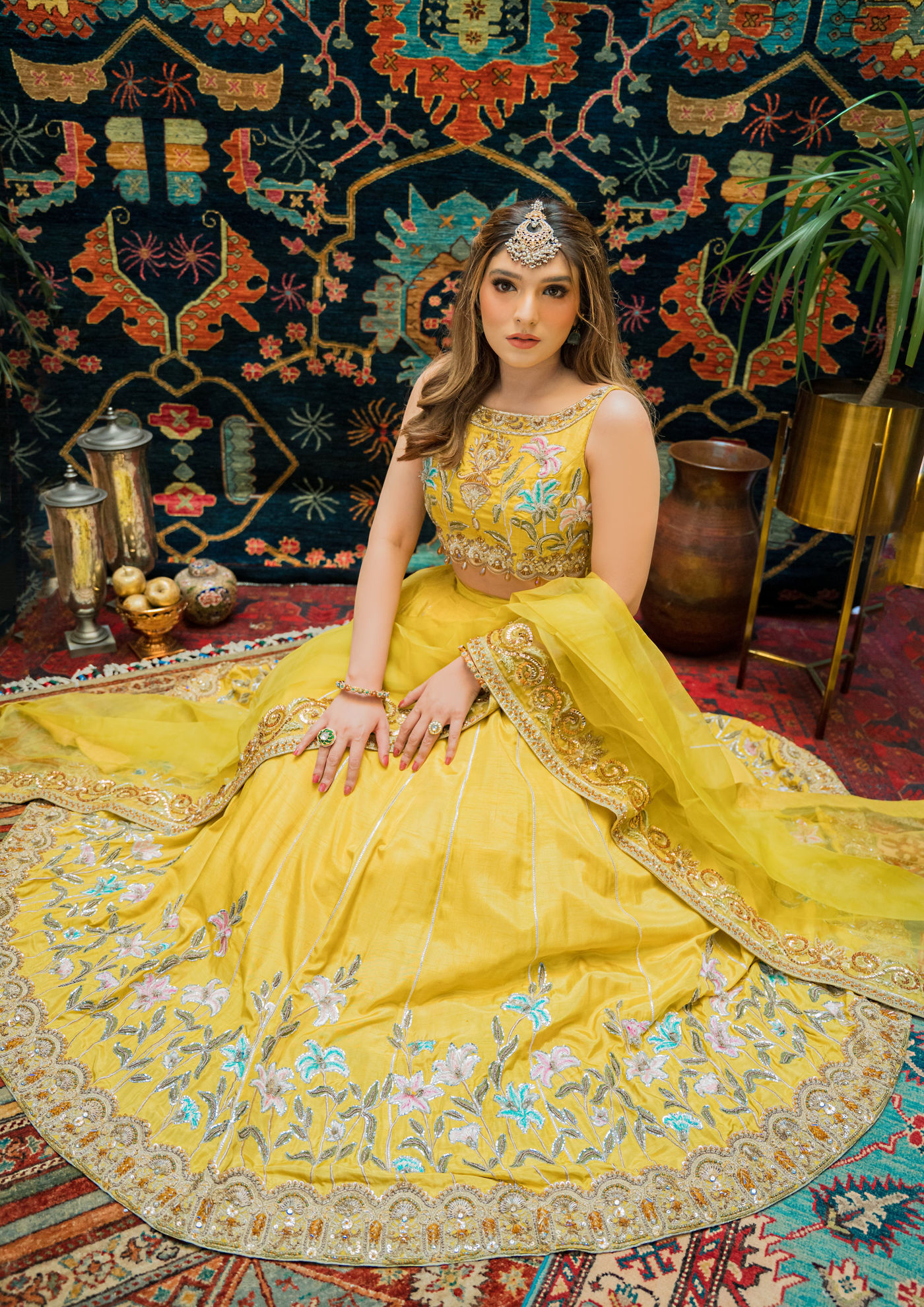 Built upon Korean raw silk, Gul e Rana dresses in an exclusive lehnga choli which is adorned with semi-precious stones making the dress feel more magical than ever. It has effortlessly been worked on using different techniques of gota work along side pitta, resham and dabka enhancements. Paired with a stunning organza dupatta with Sitara sprayed in the center, Gul e Rana is finally ready to step into the world.
