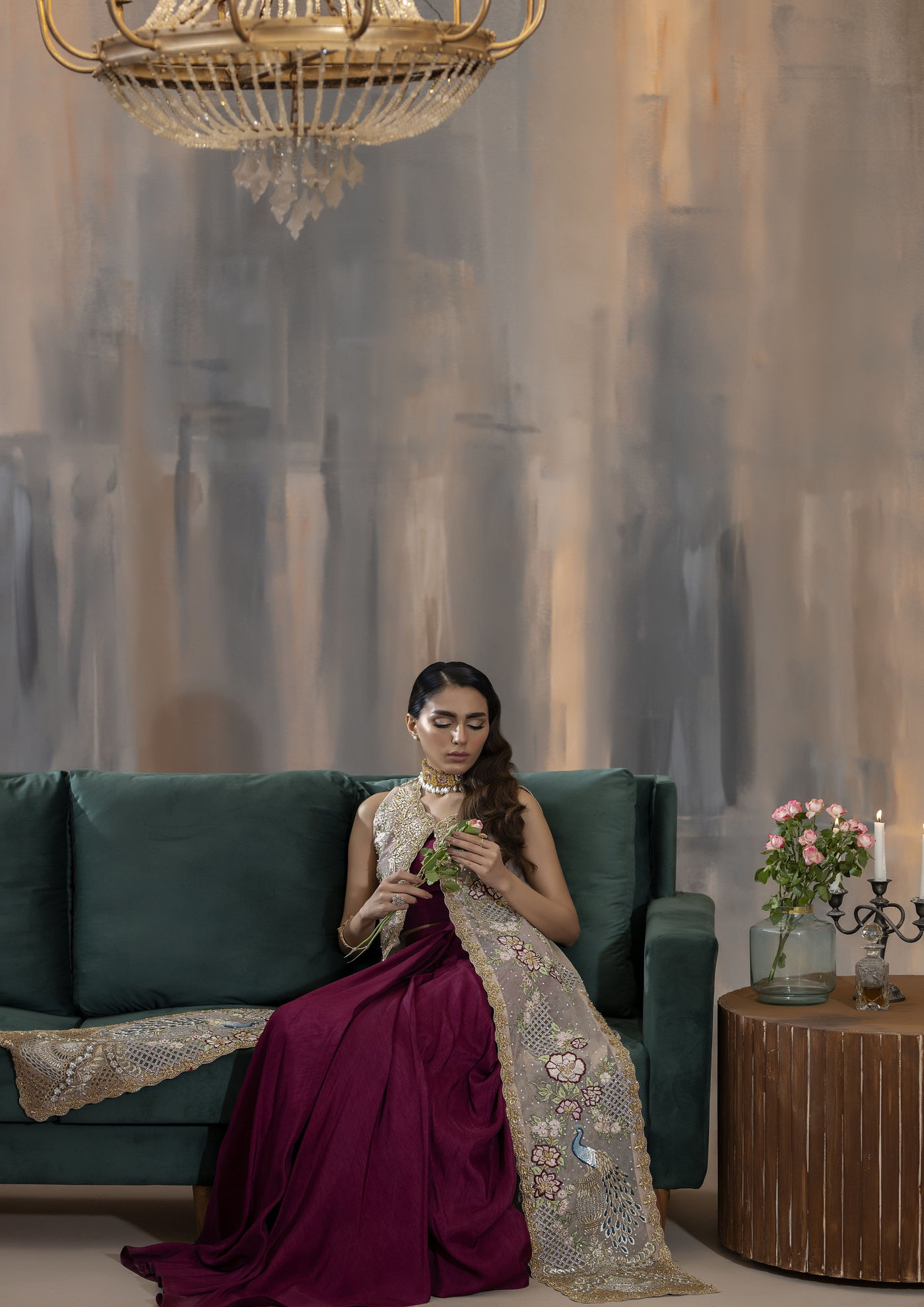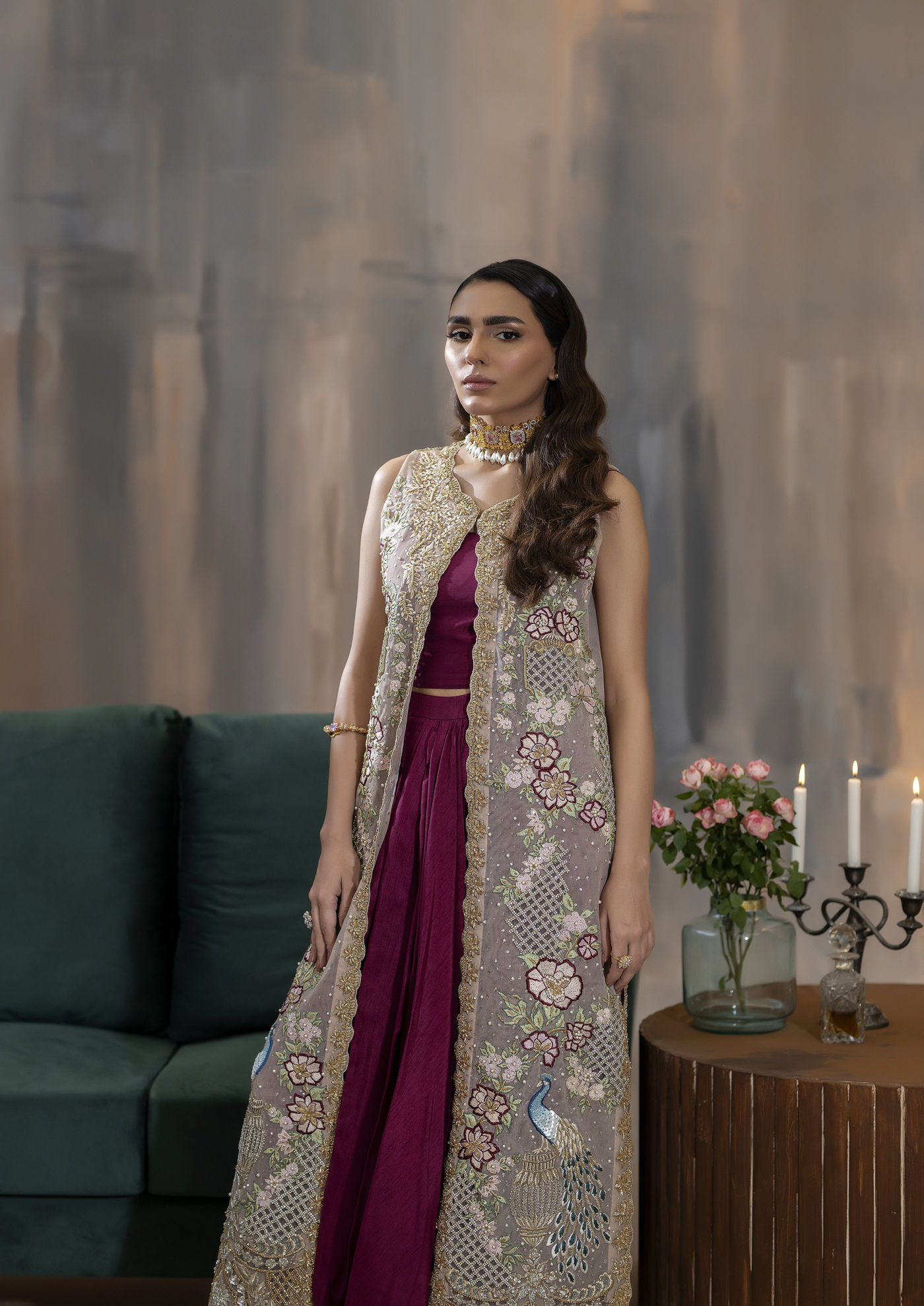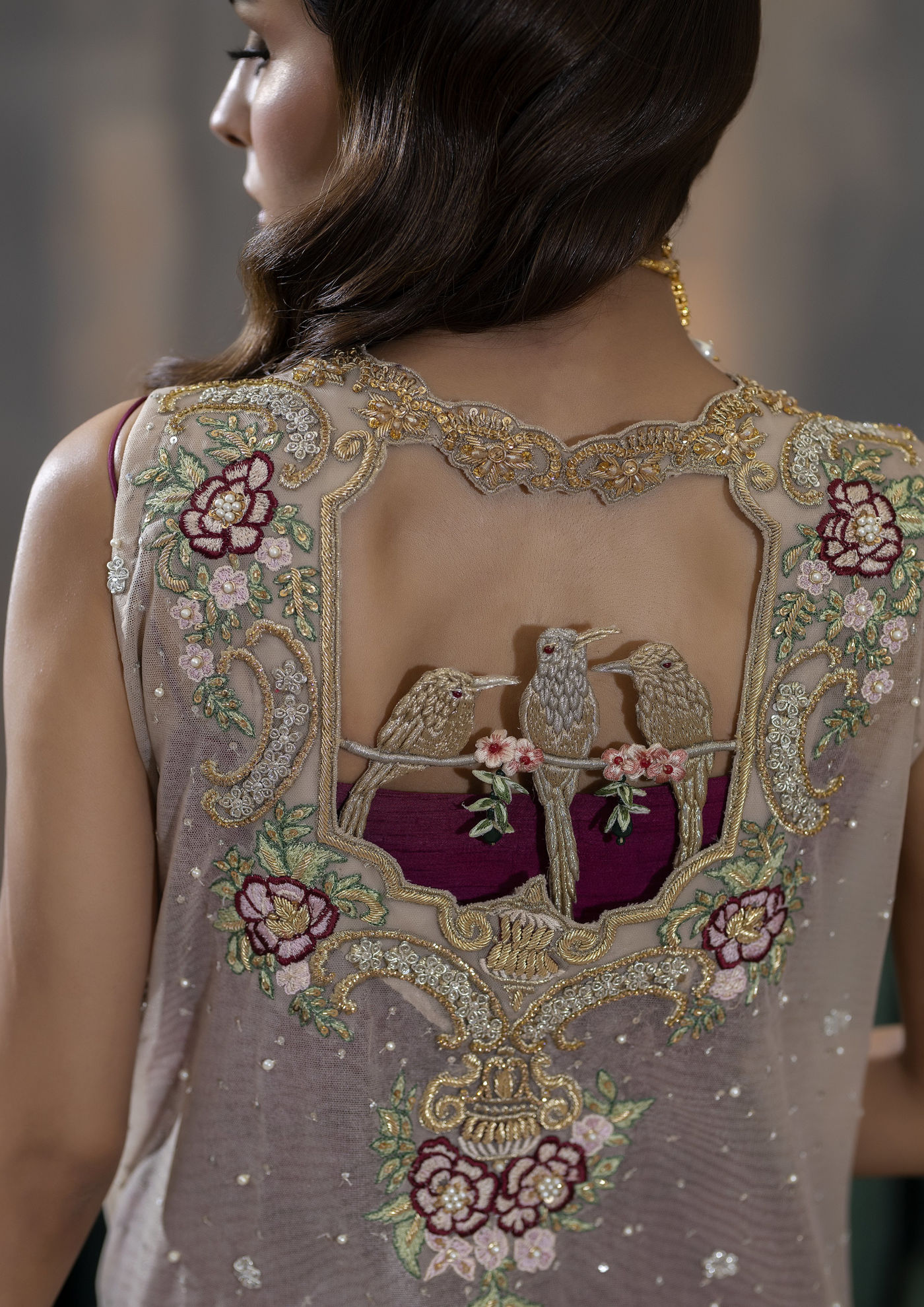 Elegance redefined in every layer. A sleek, understated skirt and top bring simplicity, while a heavily embellished long net jacket adds the perfect touch of opulence. From intricate back detailing that surprises with every turn to rich textures that exude sophistication, this look captures the essence of timeless glamour.