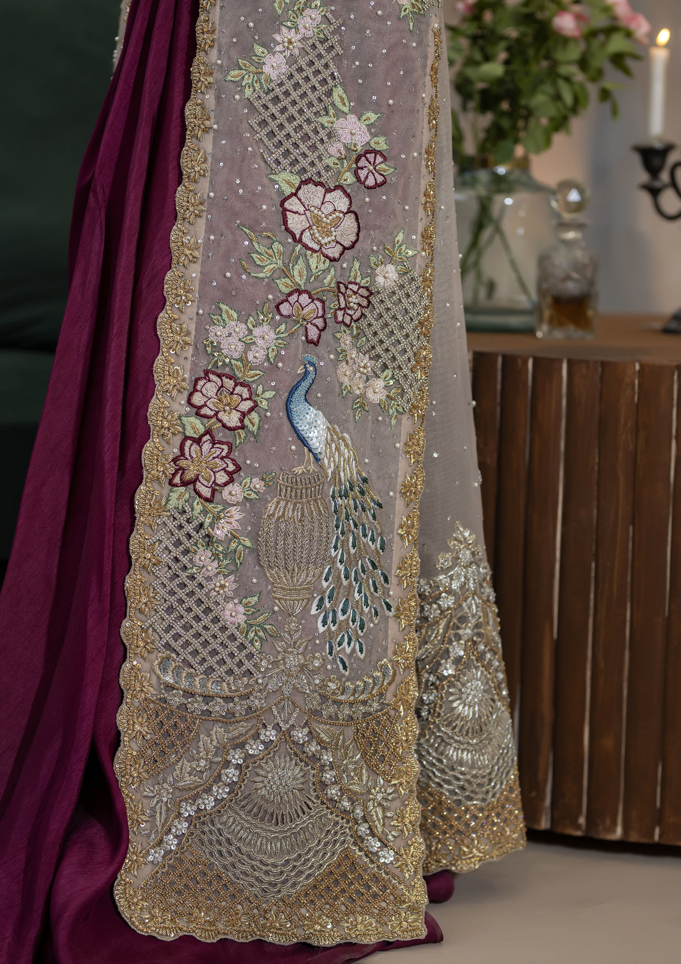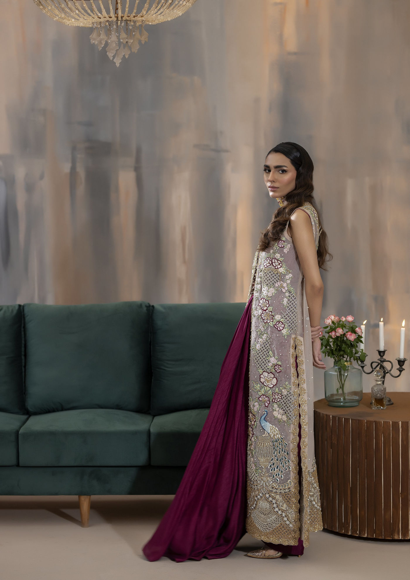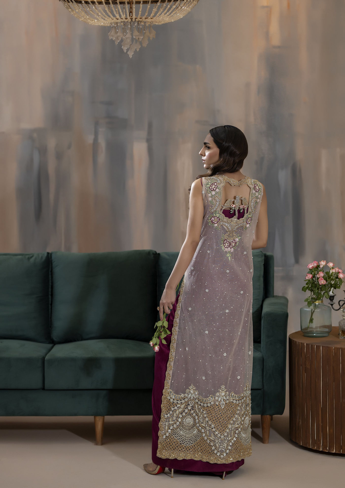 Elegance redefined in every layer. A sleek, understated skirt and top bring simplicity, while a heavily embellished long net jacket adds the perfect touch of opulence. From intricate back detailing that surprises with every turn to rich textures that exude sophistication, this look captures the essence of timeless glamour.