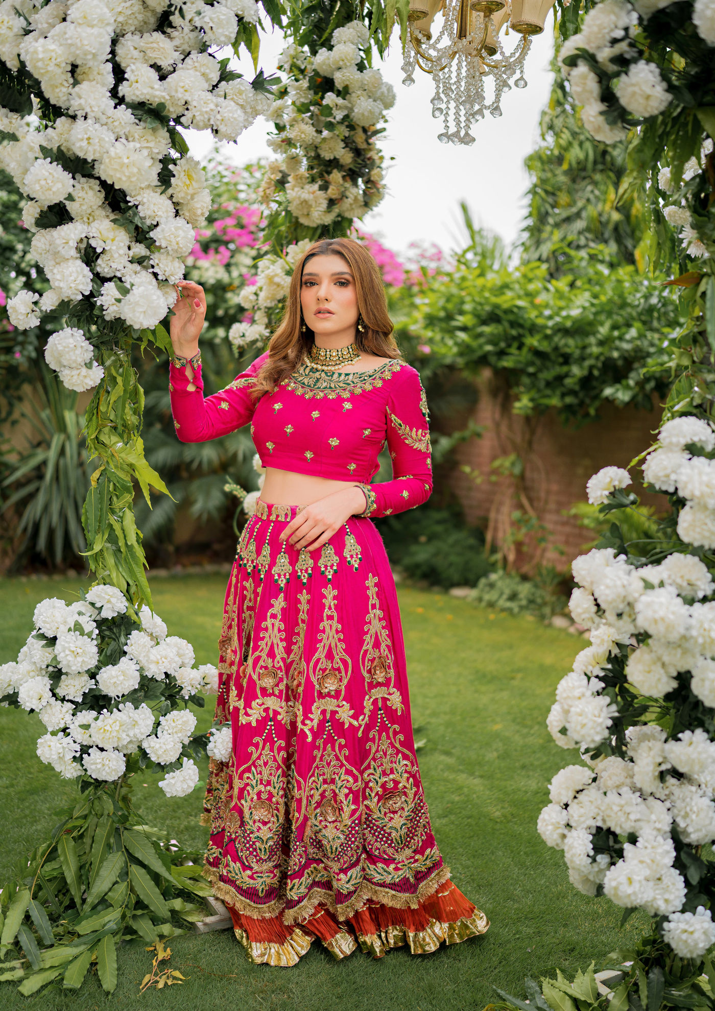 Mahi is delicately composed using resham cotton prettified with gota, stones, sitara, kora and dabka work. It is gorgeously paired with a net dupatta with a one sided border, and so Mahi effortlessly completes the dream ensemble for this wedding season.