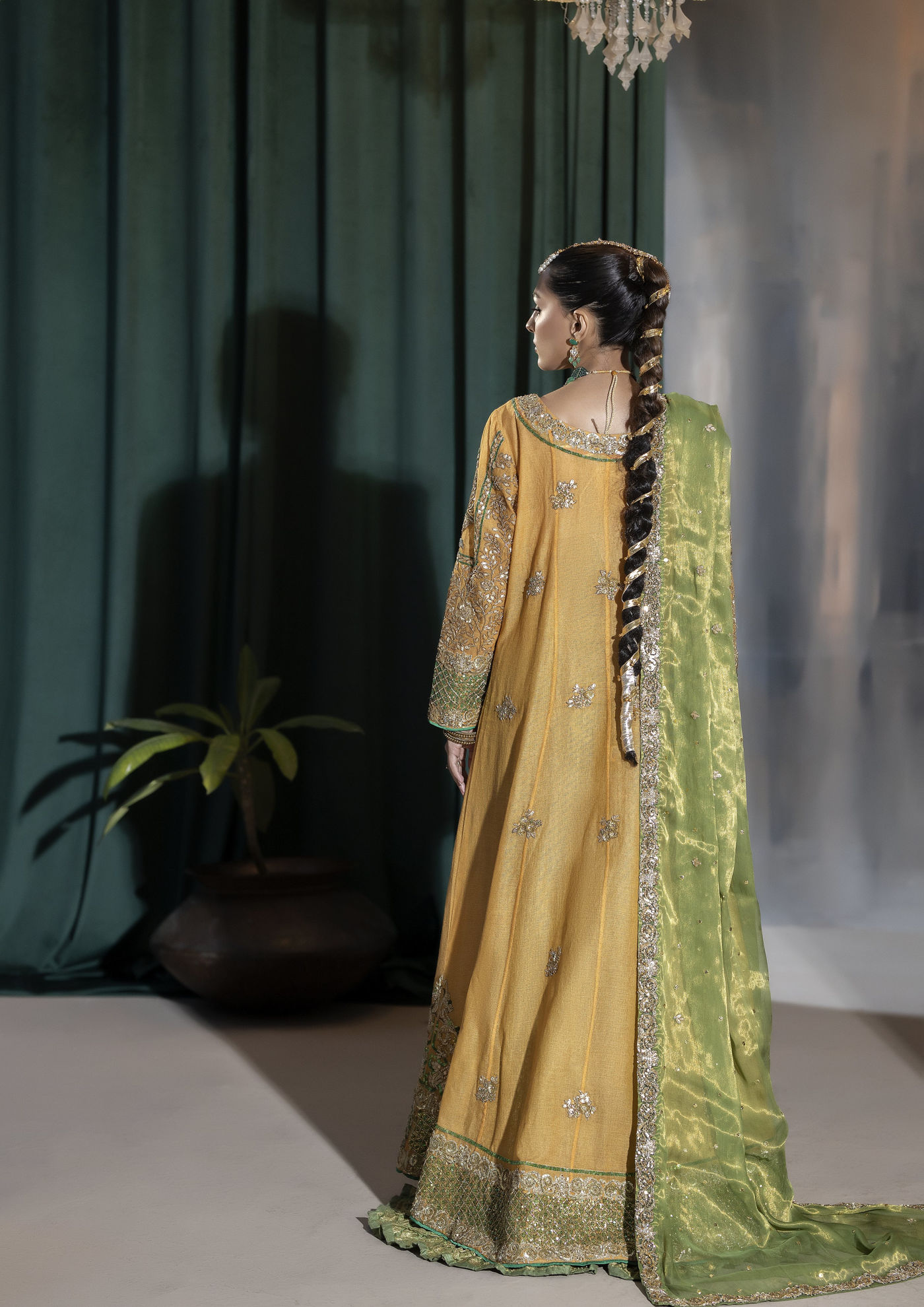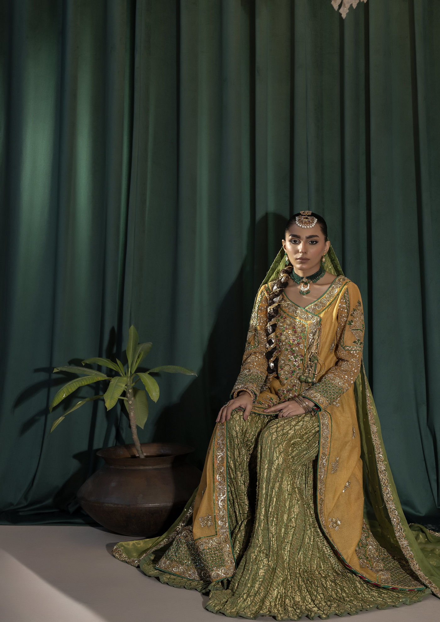 Stepping into tradition with a touch of timeless elegance . A vibrant yellow cotton net angrakha flows gracefully, complemented by a rich green jamawar gharara that speaks of heritage and artistry. The matching green dupatta adds the perfect finishing touch, creating a harmonious blend of colours and textures.