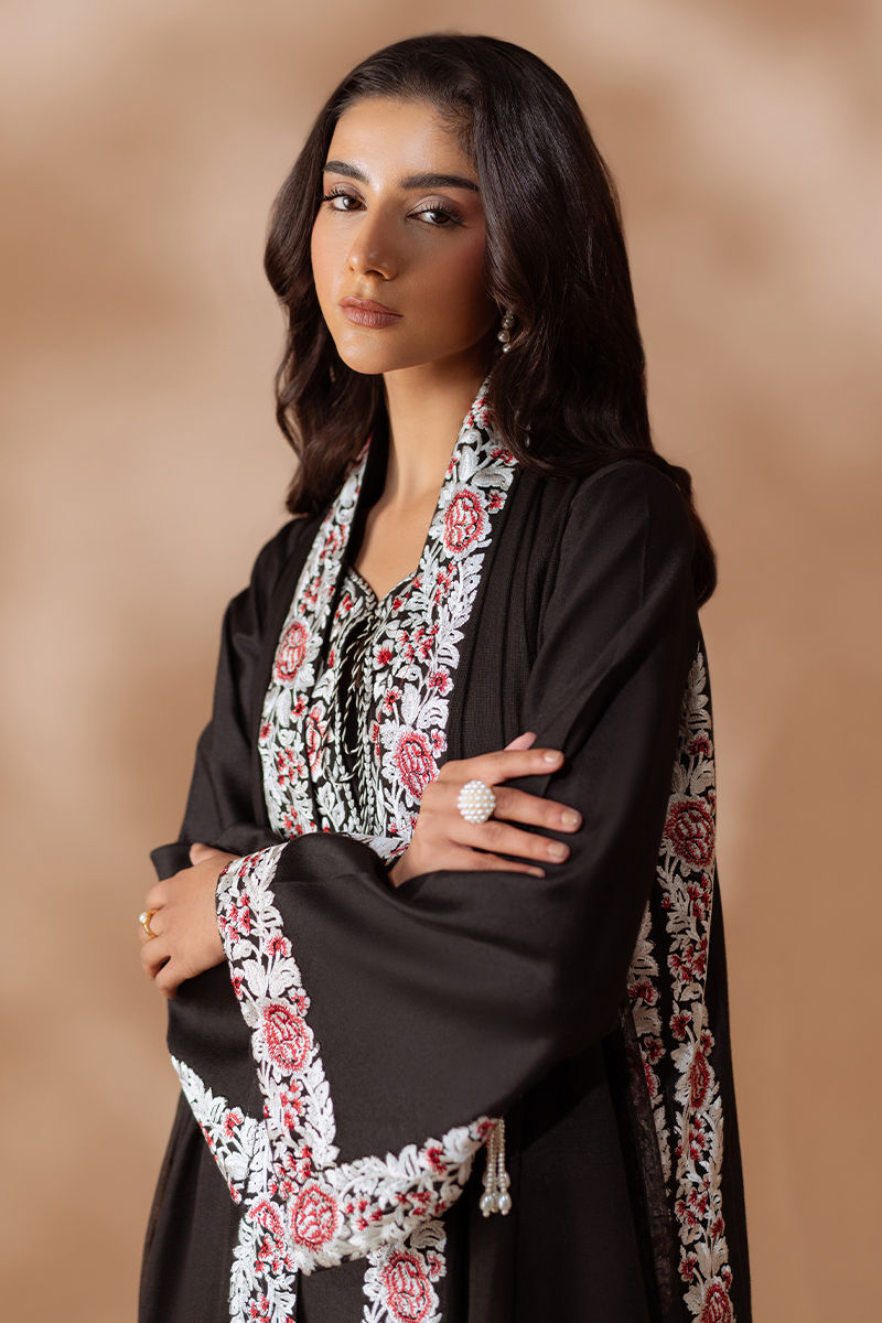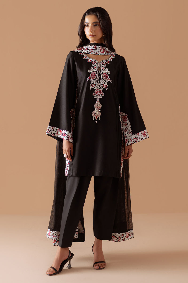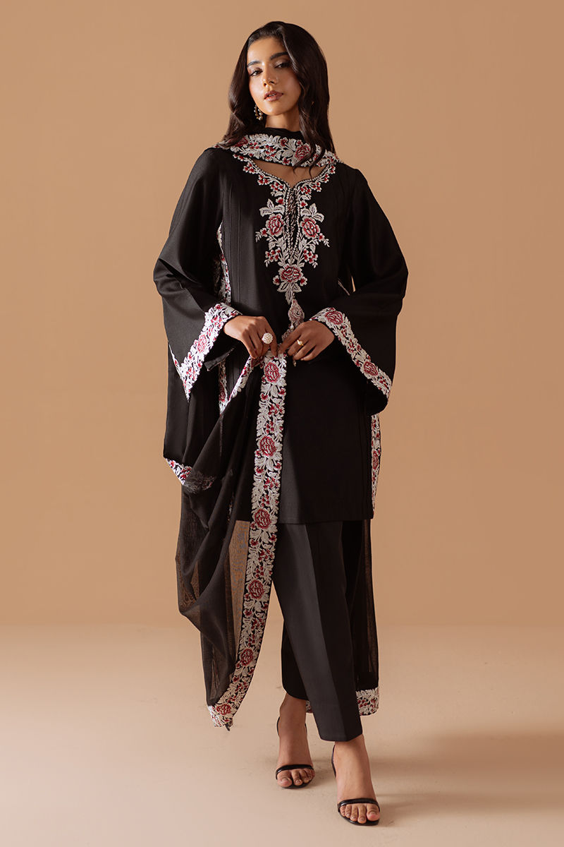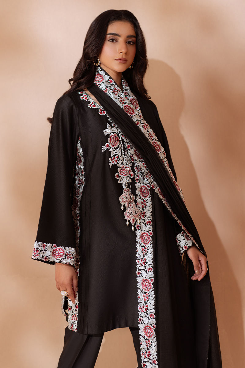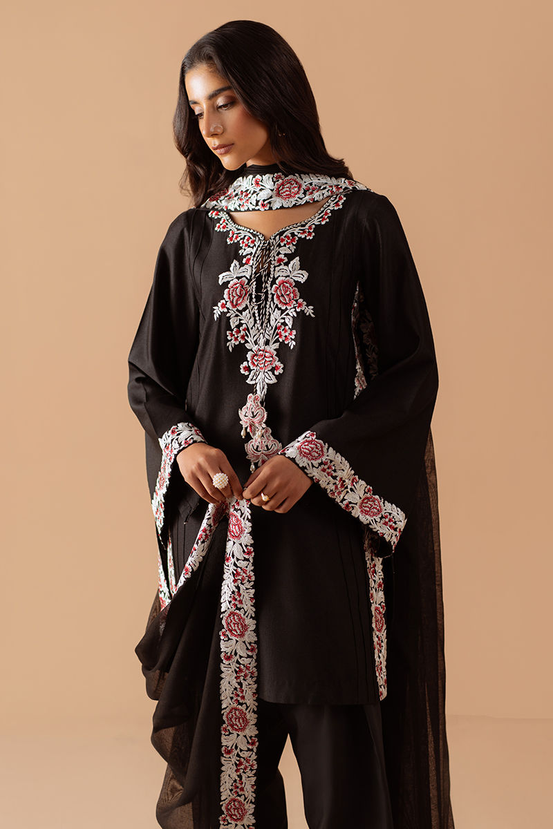 Elevate your festive wardrobe with this black cotton net shirt and cotton silk pant ensemble, featuring delicate floral embroidery, adding a modern, graceful touch to the classic silhouette. The look is beautifully completed with a flowing khaddi net dupatta that adds texture and elegance. A perfect addition to your Eid wardrobe—where timeless craftsmanship meets contemporary style.
