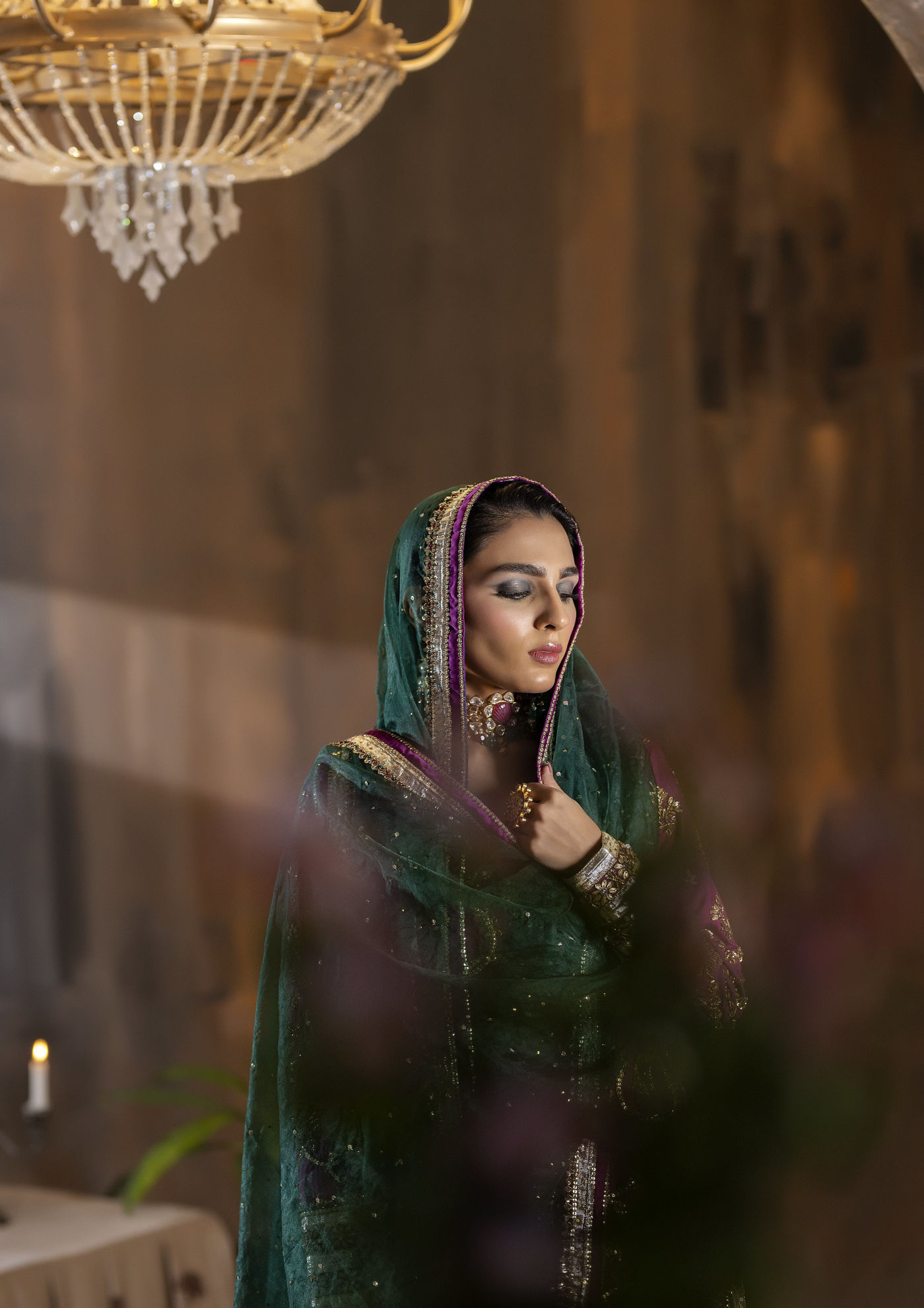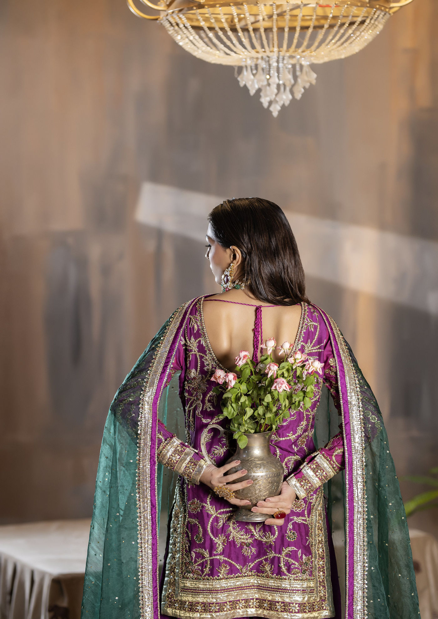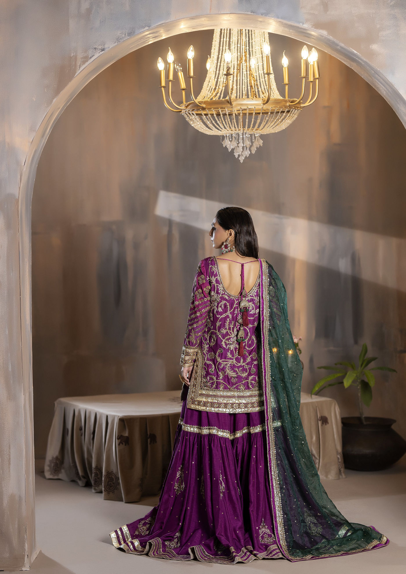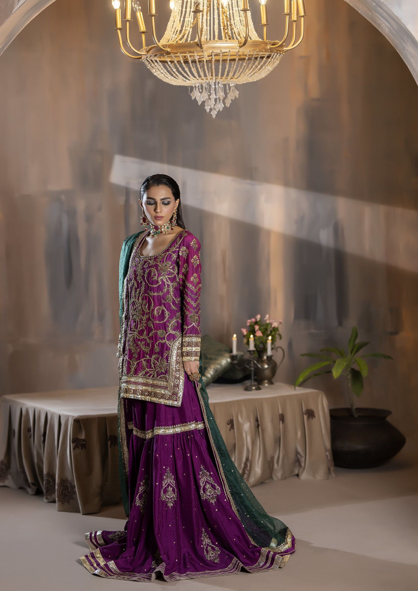 Make a statement in rich magenta! This stunning Rawsilk gharara set features intricate back detailing and a gracefully tailored shirt for a look that’s both timeless and bold. Embrace elegance with every step.