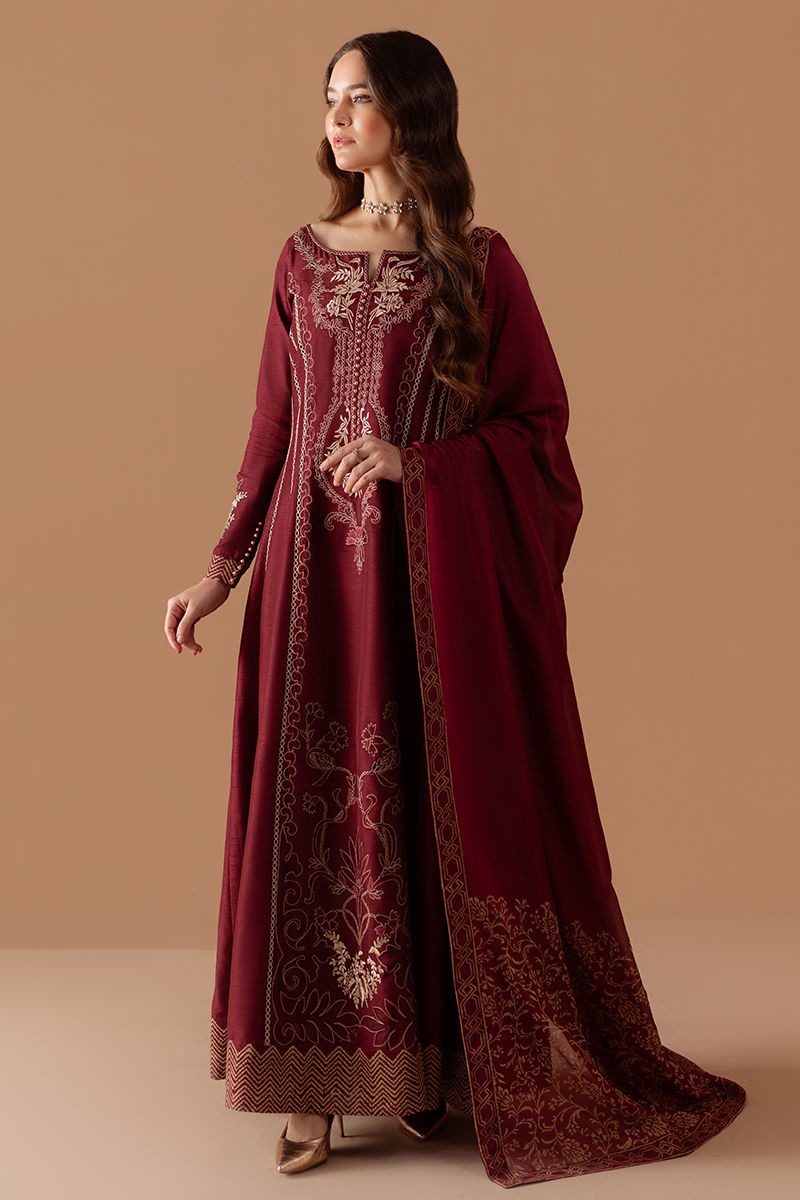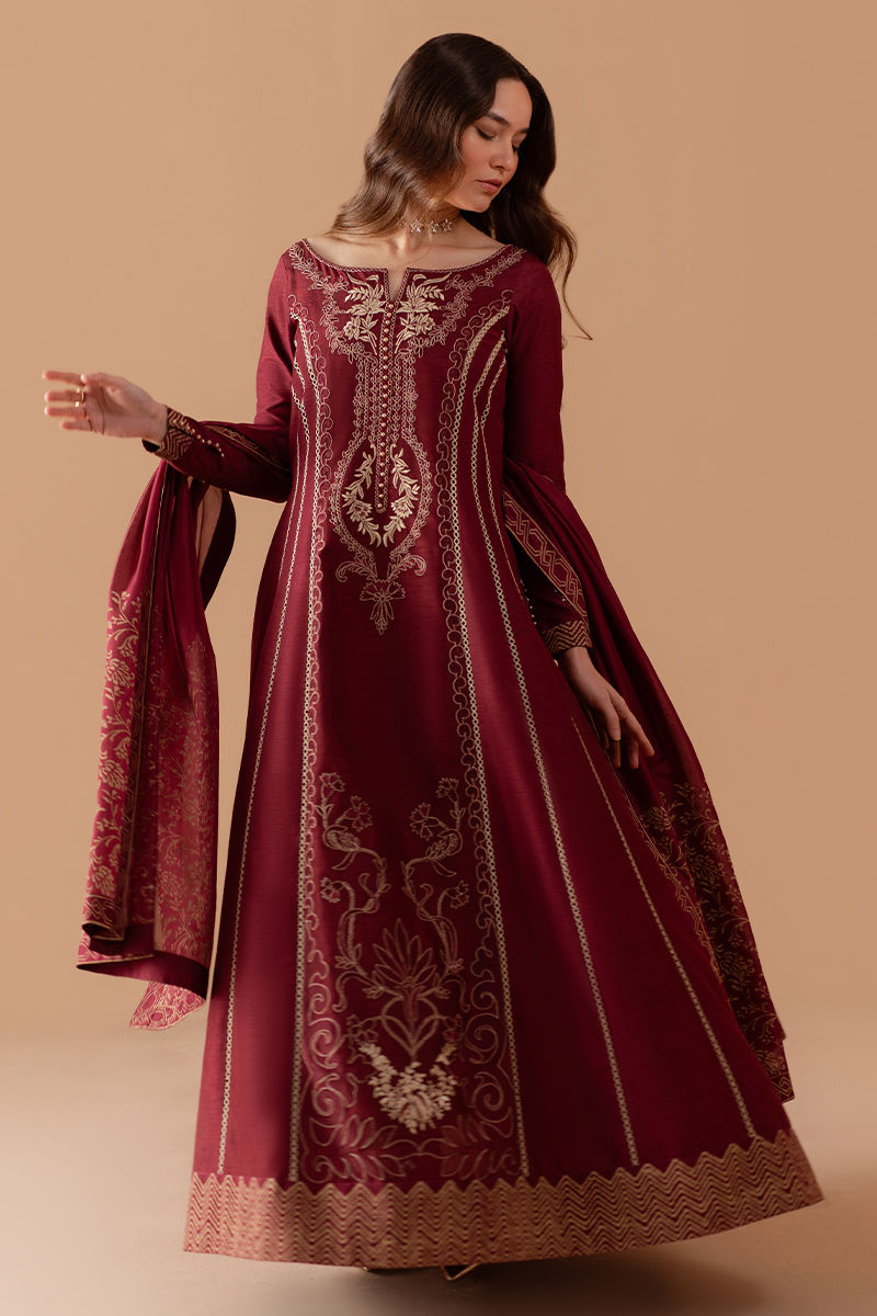 Rich, regal, and undeniably striking, this deep crimson ensemble is designed to make an entrance. Crafted from luxurious raw silk, featuring intricate embroidery that flows gracefully across the front. Paired with matching raw silk pants and a silk dopatta, effortless elegance with every step is guaranteed. Perfect for evening festivities, formal gatherings, and statement celebrations, capturing the magic of bold colour.
