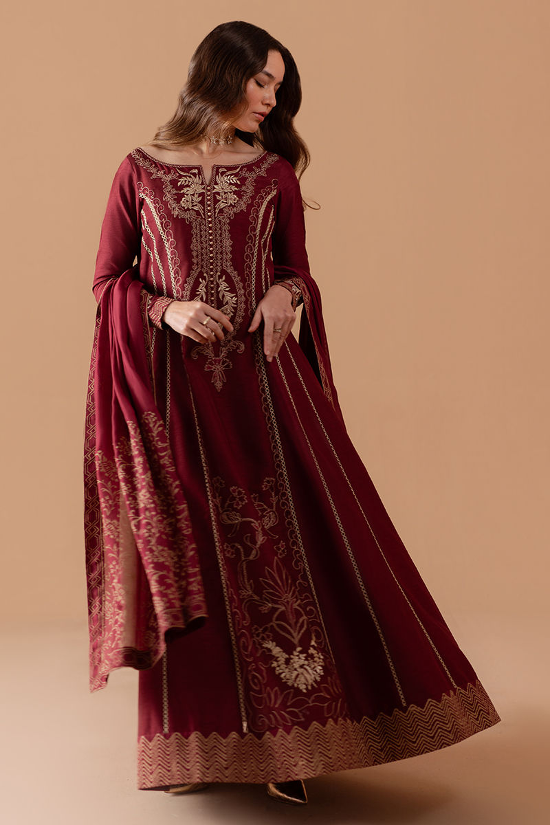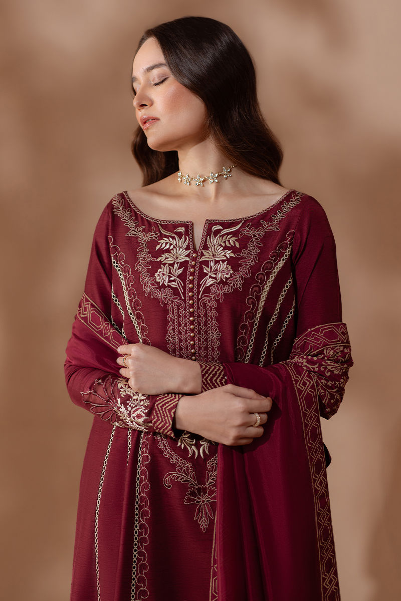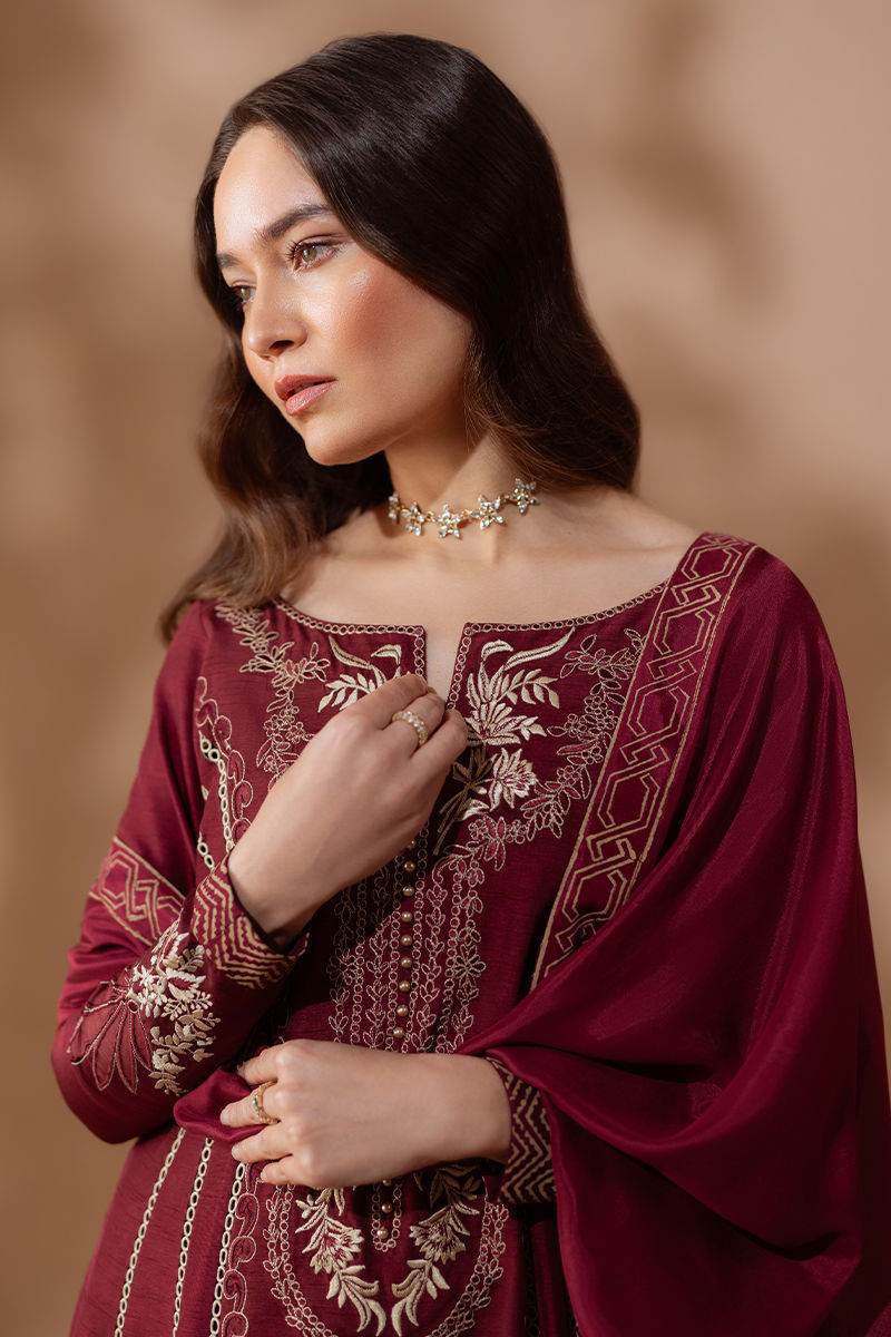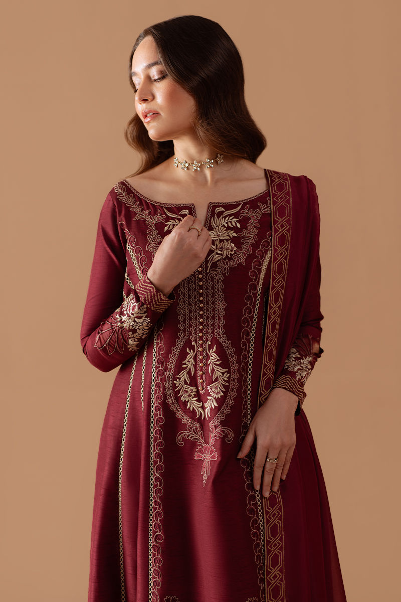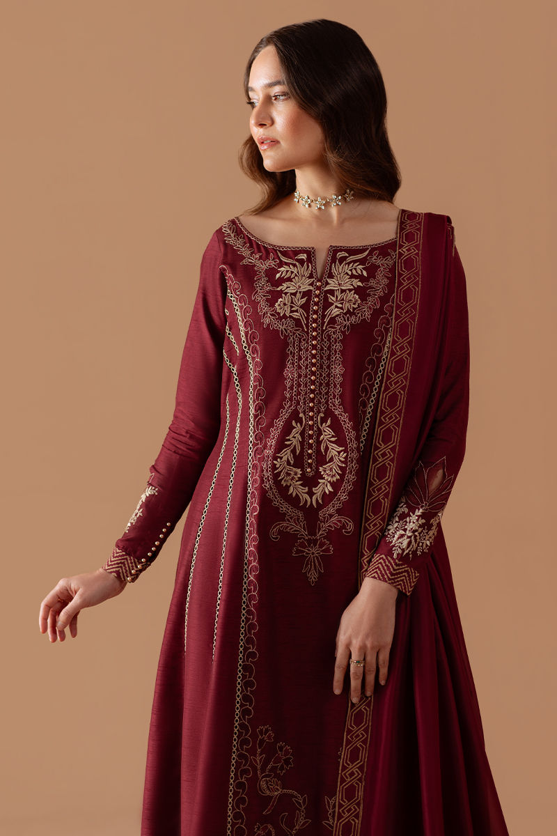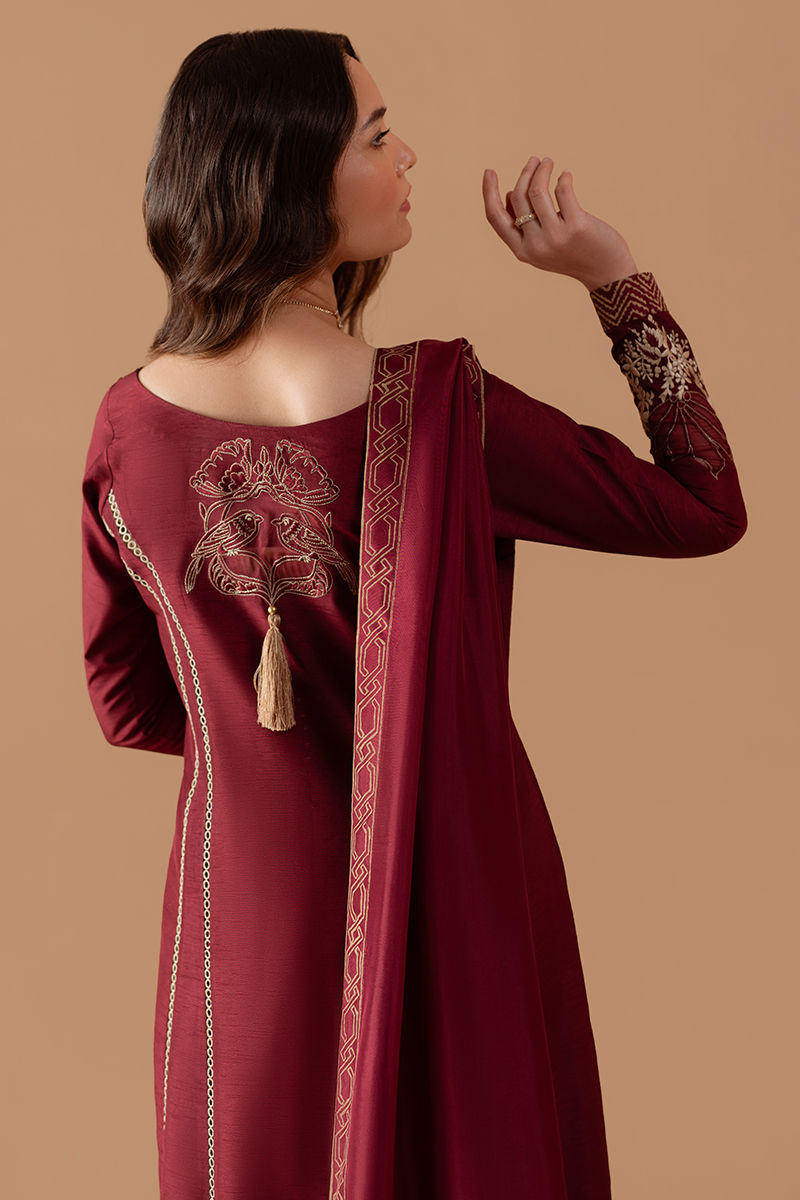 Color: Deep Crimson Fabric: Shirt: Raw Silk, Pants: Raw Silk, Dupatta: Silk Work Details: Embroidered