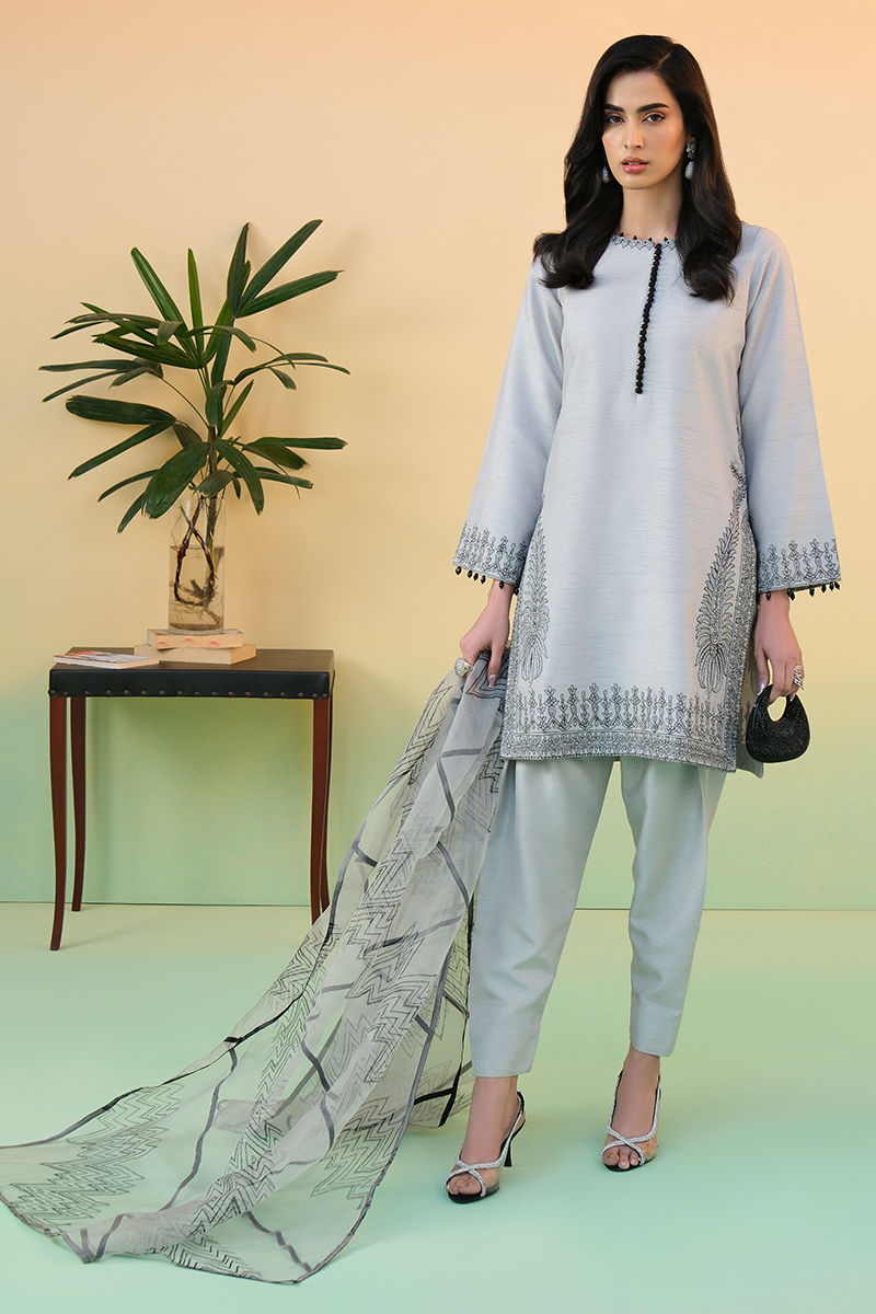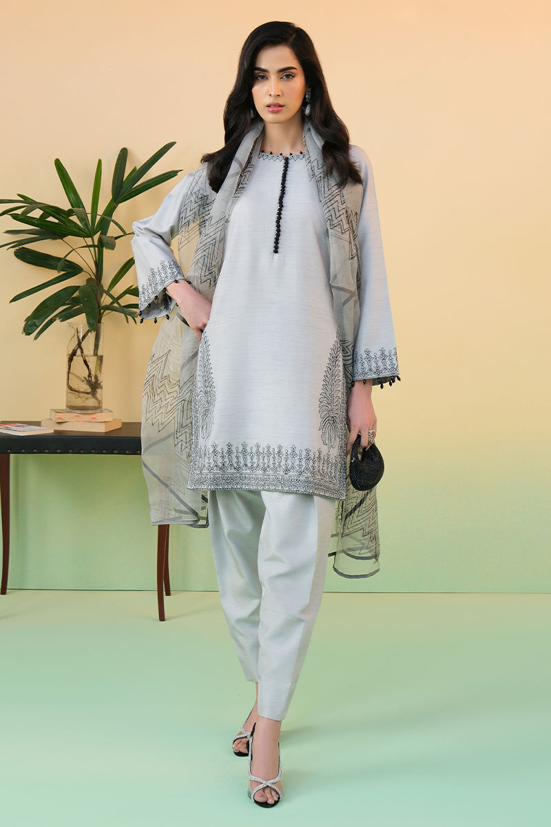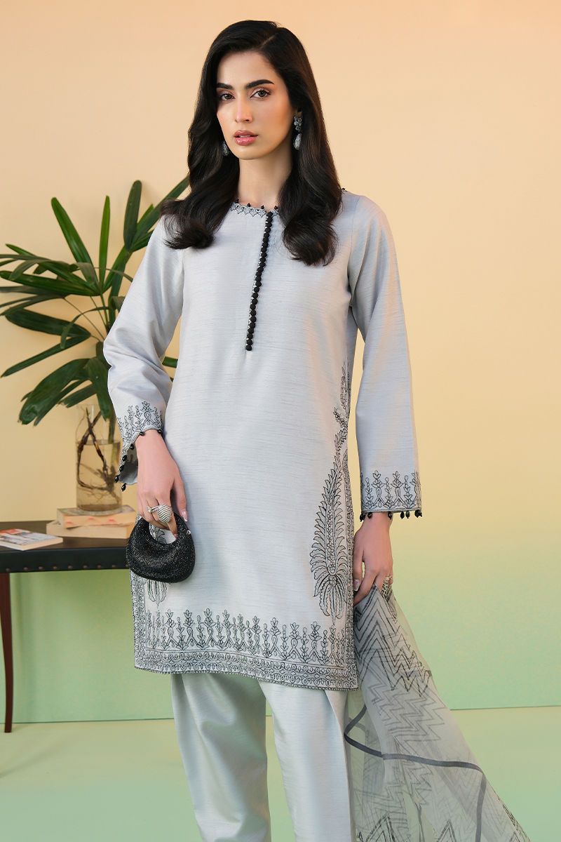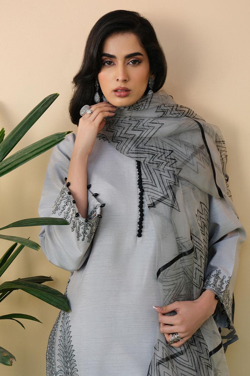 Elevate your wardrobe with this serene steel grey ensemble, designed with understated elegance in mind. The shirt features delicate black embroidery beautifully complimented by the beaded black trim on the neckline and sleeves. Paired with a matching shalwar for a seamless silhouette, the look is completed with a sheer organza dupatta adorned with striking monochrome block print patterns. Refined, graceful, and effortlessly sophisticated - this piece is perfect for intimate gatherings and elegant Eid moments.