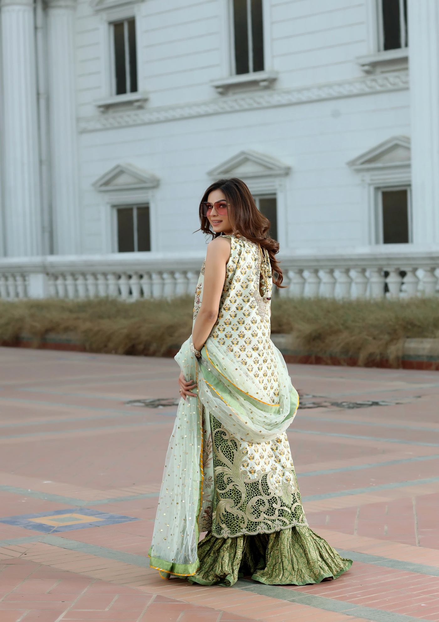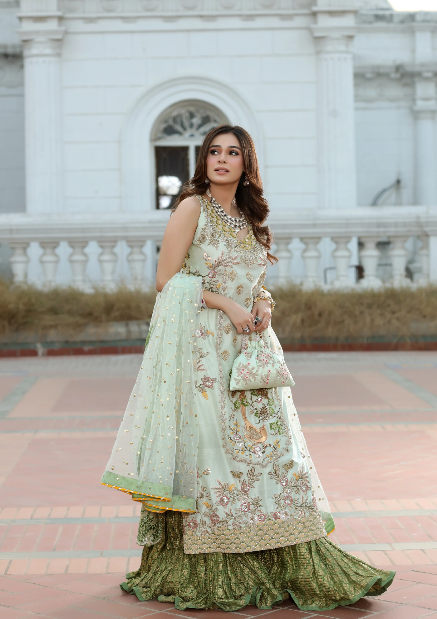 Shirt: Pastel light green pure rawsilk shirt. Handcrafted dabka, kora, zardozi, tila, kaamdani, sitara and multicoloured resham threadwork with cutwork on the front. 3D work with french knots handmade specially designed tassels are intricately created to finish the look.